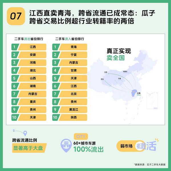瓜子二手车平台数据显示,江西省成为二手车流出最多的省份,近九成车源销往省外;而细化到城市维度,平台上有跨越60个城市的二手车供给100%流出,正在区域外告竣买卖。
