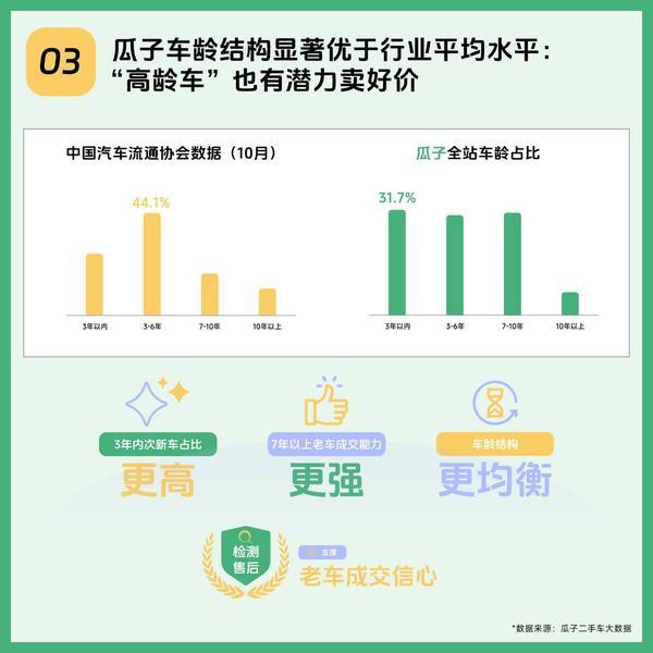 正在全国化畅通能力的下,瓜子平台可以或许帮帮用户正在折损最的阶段,为车辆婚配更普遍的潜正在买家,快速抓住时间窗口,实现更合理的成交价钱。截至2025年10月,全国二手车买卖中,车龄呈现正态分布,支流车龄集中正在3—6年,占比44%。比拟之下,瓜子平台的车龄布局愈加平衡,3年以内的次新车、3—6年的支流车型,以及7年以上的老车,正在成交布局中占比接近。特别是次新车和高龄车的成交占比,均较着高于全国平均程度。