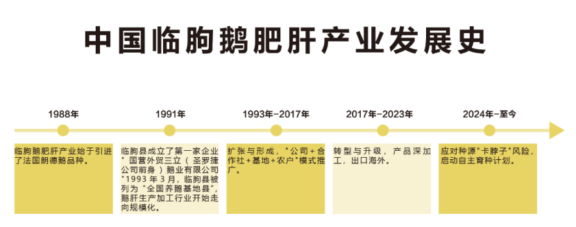 临朐鹅肥肝财产始于1988年,其时临朐县操纵取法国朗德省类似的天气前提和地舆,率先引进了法国朗德鹅品种。1991年,临朐县成立了第一家本土鹅肝出产加工企业国营外贸三立鹅业无限公司(圣罗捷公司前身),昔时50吨鹅肝出口日本并发卖一空。从法国引进了朗德鹅父母代种苗3000只进行豢养,实现了初步的贸易成功。1993年3月,临朐县被列为“全国养鹅县”,鹅肝出产加工行业起头规模化。1993年~2017年,扩张取构成,公司+合做社++农户模式推广,带动超6000人就业。财产链不竭完美,笼盖从种鹅、养殖到加工的全数环节。2017年至今,产物深加工,开辟出红酒蓝莓鹅肝、鹅肝酱等爆款产物,大幅提拔附加值。手艺研发自从研发智能填饲机,出产效率提拔5倍以上。积极拓展海外市场,产物出口至欧盟、日本、东南亚等地。2024年11月,为应对种源卡脖子风险,临朐县启动研发培育中国朗德鹅本土种鹅,落实省委林武指出的朗德鹅种源卡脖子问题项目。2025年5月,朐县首批最大规模的引进法国祖代朗德鹅苗约1260只。临朐鹅肥肝财产历经38年的成长,成功地将一款洋食材打形成产值冲破80亿元、毗连国际餐桌的中国新特产。