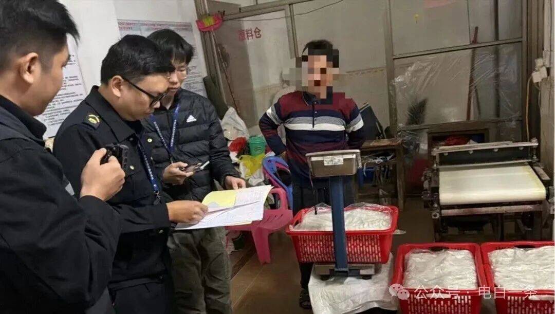 2025年11月27日,电白区市场监视办理局对不雅珠镇一家湿米粉出产厂家开展专项法律查抄,成功查处一路无证出产加工发卖湿米粉案件,无效消弭了严沉食物平安现患。