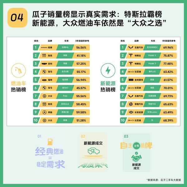 取保值率榜同步发布的,还有基于瓜子实正在成交数据的销量榜单。榜单显示,正在燃油车市场中,哈弗H6位居成交量榜首,其三年保值率也连结正在较高程度,兼顾保值性取畅通性。同时,公共旗下的Polo、朗逸等保守抢手车系,正在二手市场中也仍然具备不变的买卖需求,持久占领销量前列。